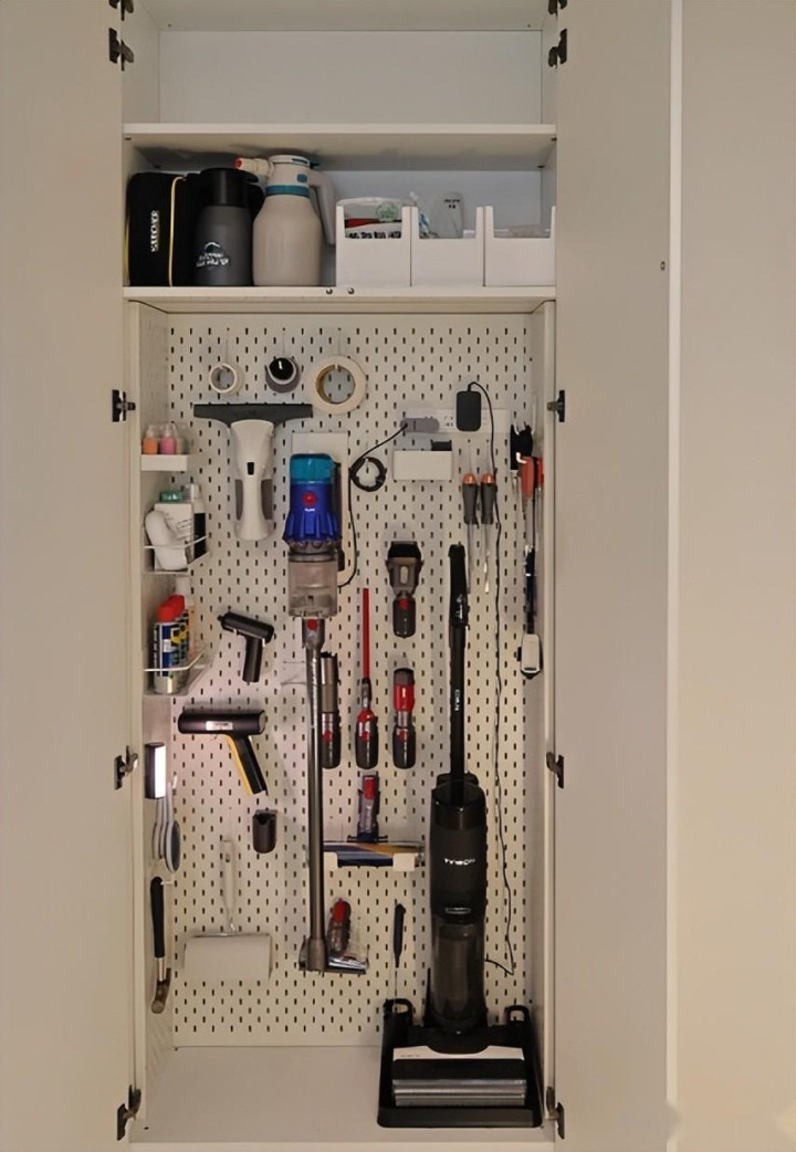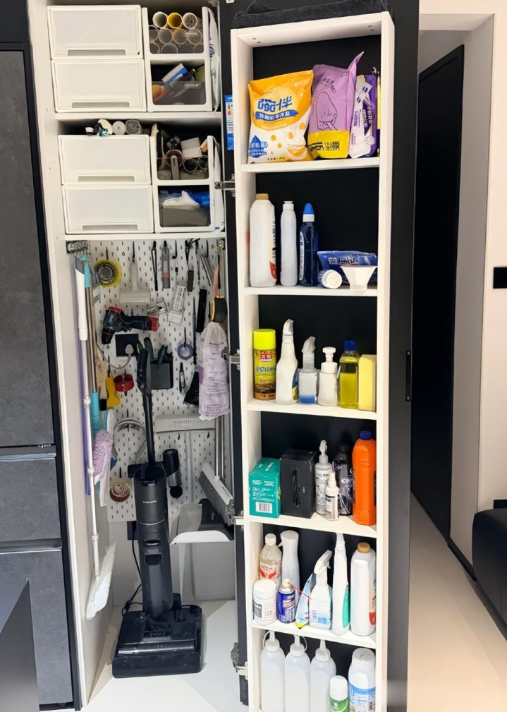 在居家生计中,咱们会用到好多东西,什么吸尘器、扫把、刮板、洗衣液、纸巾等等, 这些东西没处所收纳,你只可堆积在边际中,要不会占据其他柜子空间,太难用。