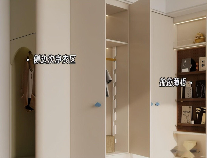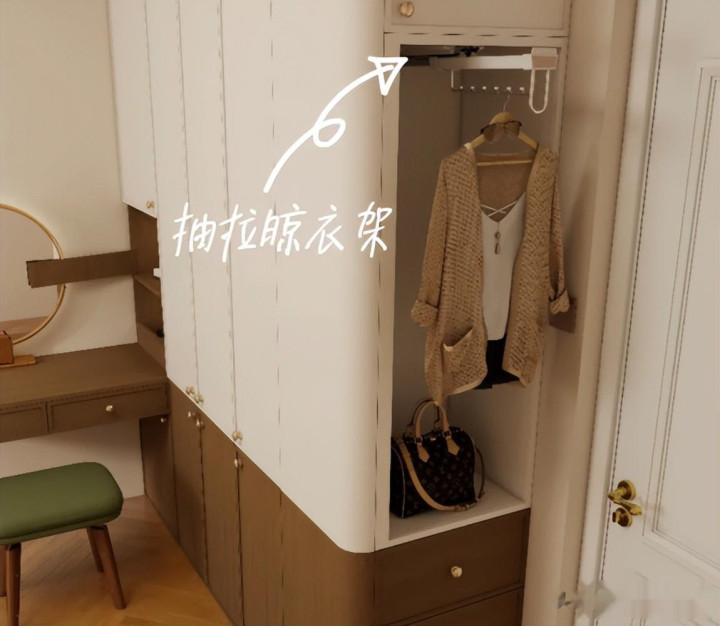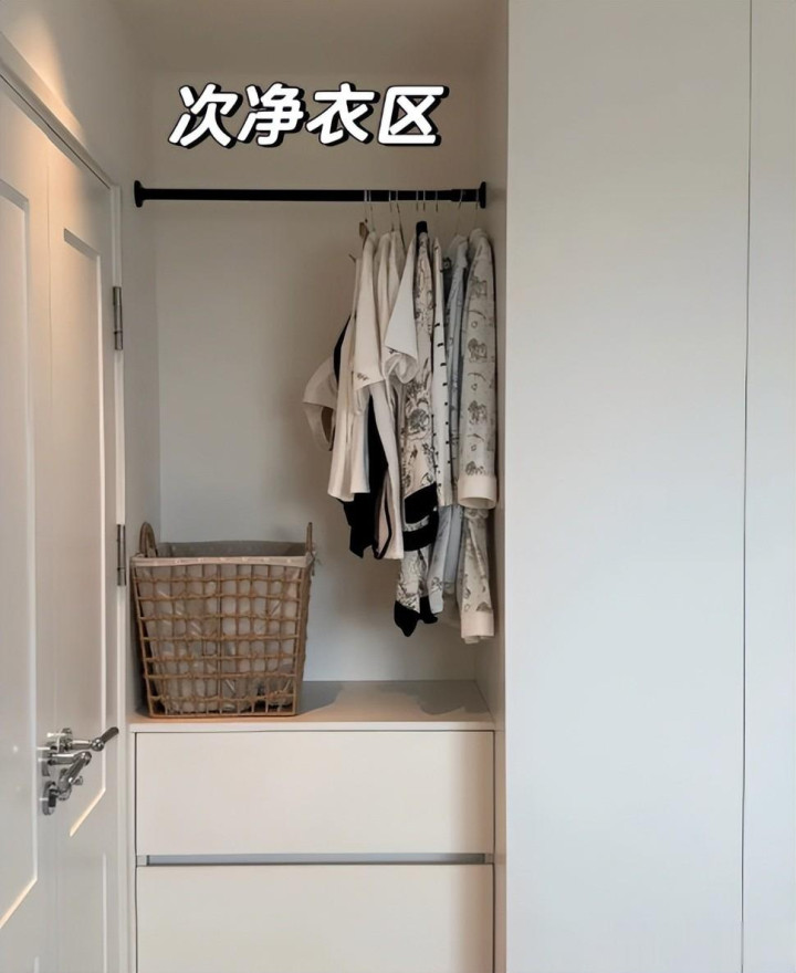 次净衣区不要堤防尺寸,你就把柄你衣柜侧面的空间预留出来就行, 在上头挂上晾衣杆,能把频繁穿的衣着都收纳其中,幸免跟衣柜中干净的衣着搀杂在沿路。
