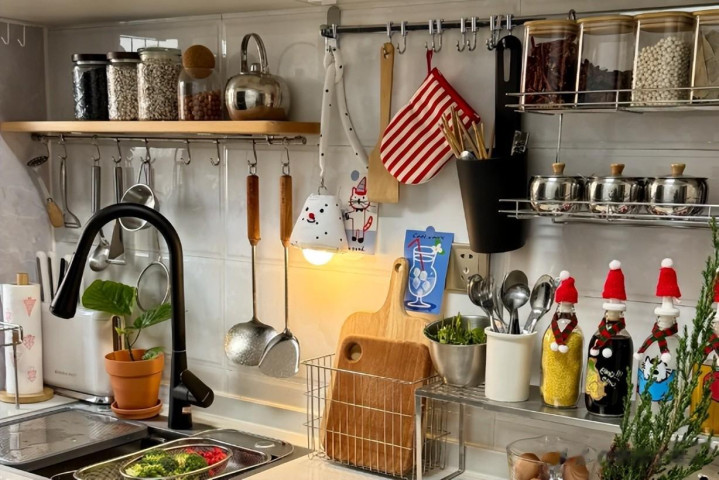 2️⃣墙面收纳 墙面收纳相比毛糙了,不错放免打孔的收纳架,用来收纳调料巧合常用的厨具,不占台面处所。