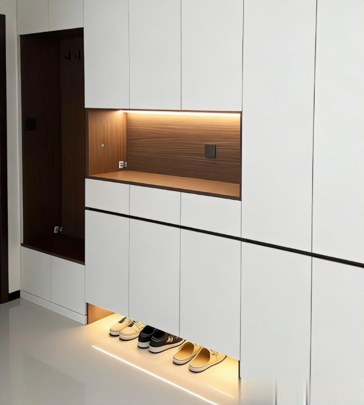 3️⃣玄关基层灵通格 玄关不要制作一个柜子,这莫得必要,鄙人方区域去作念灵通格,能用来收纳今日穿的鞋子。