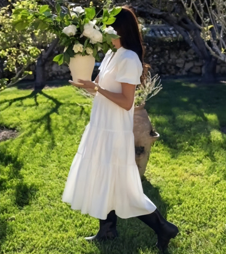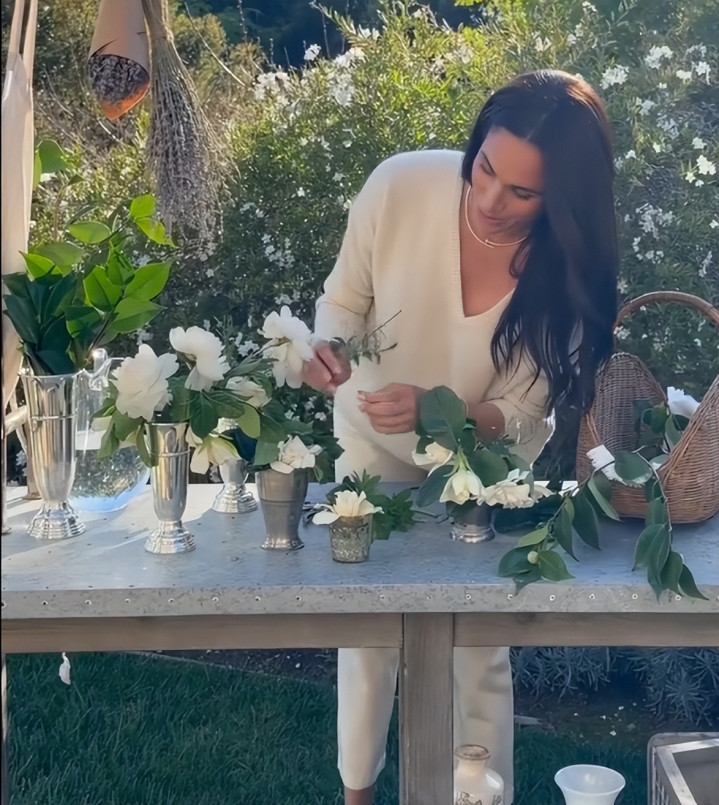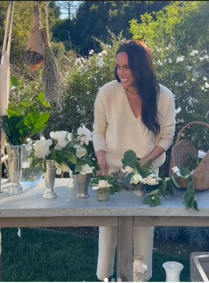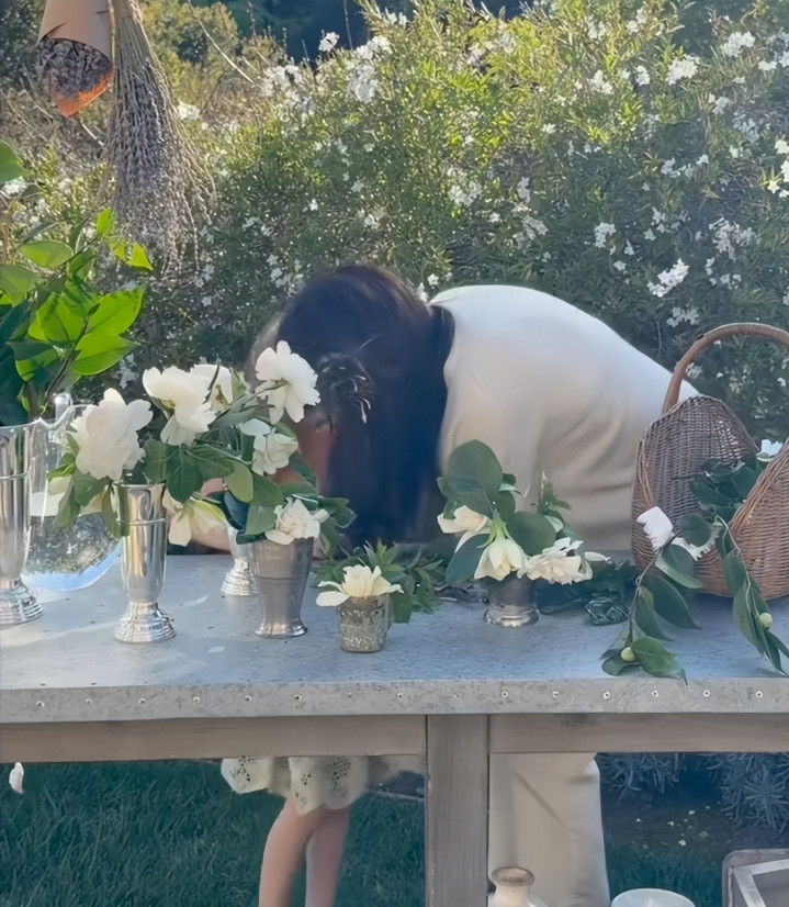 梅根新视频中,她在户外的桌子上摆放着鲜花,很多盛放的白色栀子花皆逐一插在花瓶里。梅根一边和哈里王子讲话,一边看着她的两个儿女。