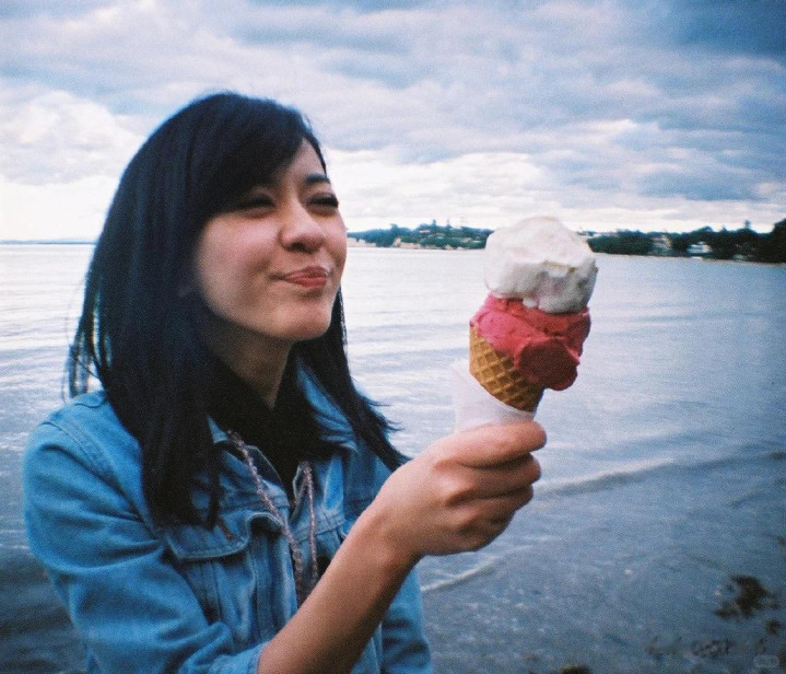 白色百褶短裙搭灰色真挚背心,头上戴粉色蝴蝶合髻箍,背上还背了个玩偶包包,典型的校园风穿搭。