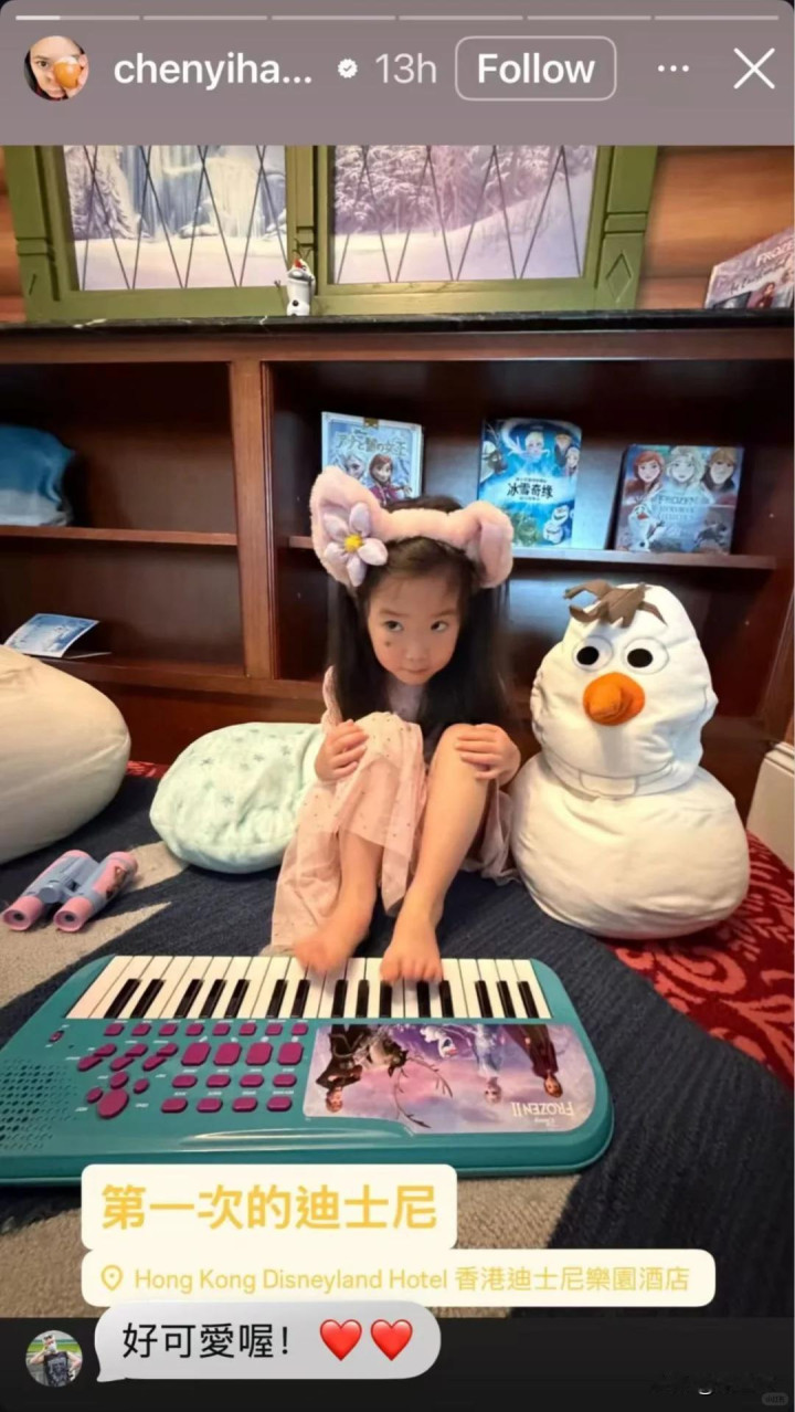 才4岁的她身高一经长了不少,五官长开后越来越像陈意涵,尤其是那双大眼睛,和姆妈如出一辙。