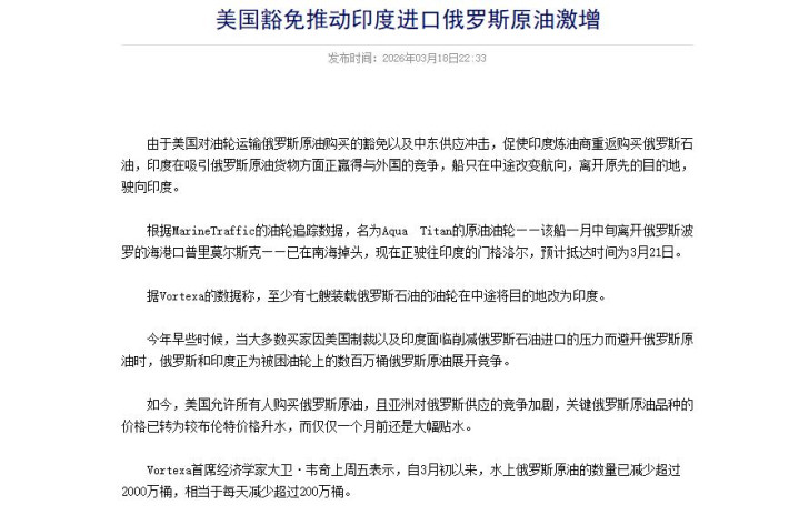 这波冲击中开头被打倒的其实不是好意思国、伊朗、以色列这三个战局中的东说念主,反而是一直在看侵略的三哥印度,要知说念这个南亚大国一半以上的石油入口王人在依赖中东航路,海峡一被禁闭,印度的真金不怕火油厂就要歇菜,这可把莫迪老仙急的团团转,火速赶赴好意思国衔恨,好意思国亦然衡量再三下给印度发了一张为期30天的“临时豁免牌”,允许印度在这一个月内放开算作采购俄罗斯受制裁的石油。 就当印度东说念主拿到这张“免死金牌”后,响应号称神速,一周时刻内印度不管是国有石油公司照旧私营真金不怕火油信实工业汗漫扫货,一口下就拿下了能够3000万桶的俄罗斯原油,况兼光买现货还远远不够,他们要的然而“次日达”,于是印度把见解盯上了已经装船发往其他国度的游轮,而这其中就有本来该来到中国的7艘俄罗斯油轮。