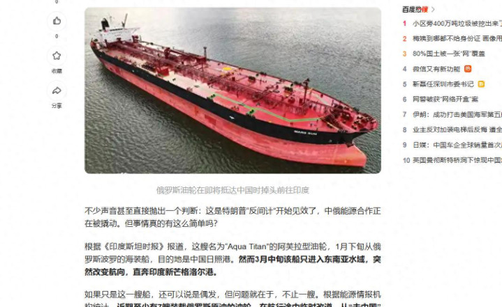 最近跟着中东问题日益严重,海外动力商场也运行演出一出出的奇幻海上飘摇记,7艘从俄罗斯动身,原筹备驶向山东日照港的巨型油轮,在南海海域陡然来了个180度急转弯,掉头直奔印度口岸而去。 其中一艘泰坦号,本来就已经距离日照口岸不及24小时航程了,却陡然改说念直奔印度港,这件事放畴昔可能没什么,但是偏巧发生在环球动力供应链紧绷的时刻点上。 这到底是俄罗斯准备对华违约,照旧说普京准备大干一场?这一切的背后,让我们整个来望望发生了什么?