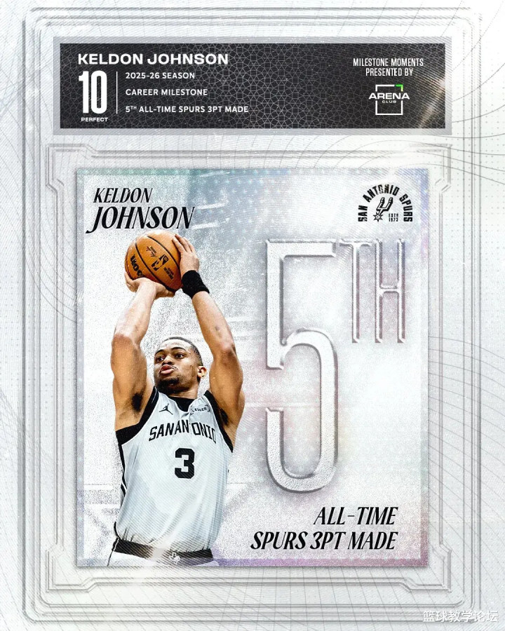马刺这边,也有球员扫尾里程碑:凯尔登-约翰逊马刺活命三分掷中数达到662记,超过鲍文升至队史第五。马刺队史三分掷中数前四名区别是:吉诺比利(1495)、帕蒂-米尔斯(1171)、丹尼-格林(959)、瓦塞尔(755)。