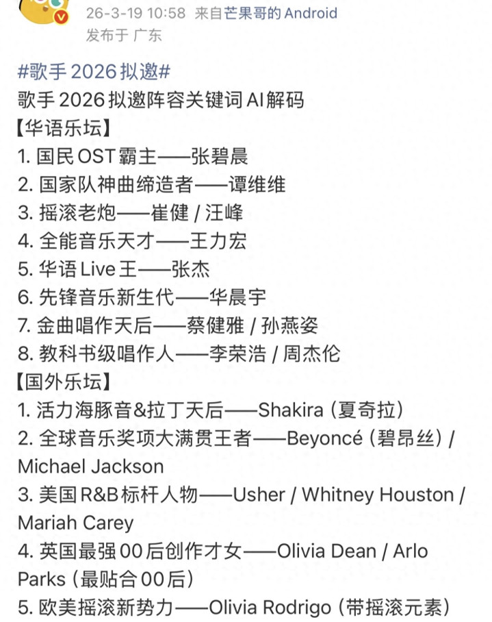 从华语顶流到海外天后,从摇滚老炮到唱作天才,这份拟邀名单莫得流量噱头,全靠实力谈话,完好兼顾心扉与专科。 既有周杰伦、碧昂丝这么的世纪级加盟,又有崔健这般乐坛前辈镇守,还有一众实力派唱将添砖加瓦。