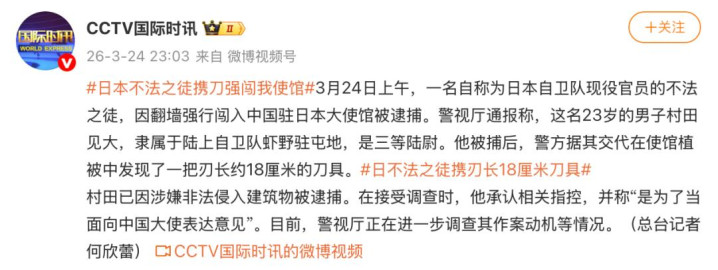 与此同期这份蓝皮书草案的曝光,还赶上了另一个时候点。 就在3月24日上昼,又名自称日本自保队现役官员的须眉,翻墙强行闯入了中国驻日本大使馆。这东说念主身上带着自保官证件,还藏着一把刃长约18厘米的刀具,威胁要以“神的时势”杀死中国社交东说念主员。
