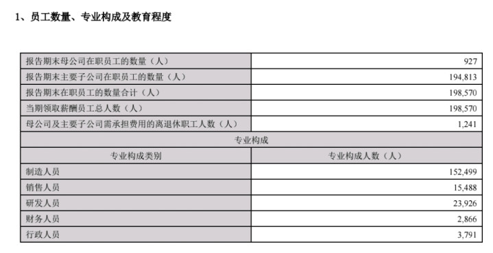 雇员与薪酬 截止年底,好意思的集团公司在任职工数目198570东谈主,分专科组成: 制造东谈主员152499东谈主,占比76.8%; 销售东谈主员15488东谈主,占比7.8%; 研发东谈主员23926东谈主,占比12.0%; 财务东谈主员2866东谈主,占比1.4%; 行政东谈主员3791东谈主,占比1.9%。