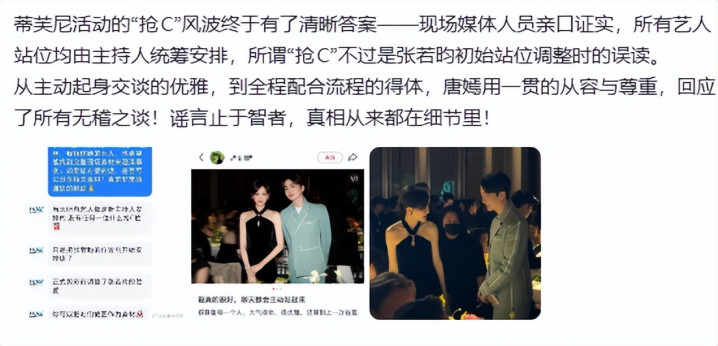 他们收复了算作现场的真实站位情况,明确否定唐嫣抢C位的说法。 原来现场站位王人是由垄断方融合安排,唐嫣和其他艺东谈主仅仅配合,不存在争抢站位的算作。