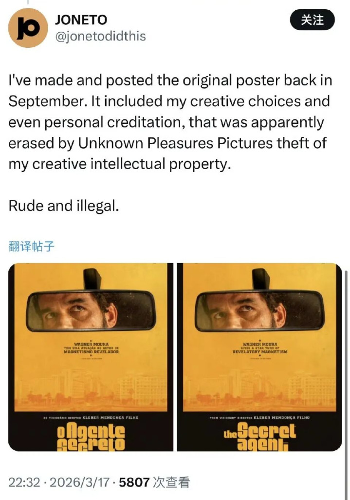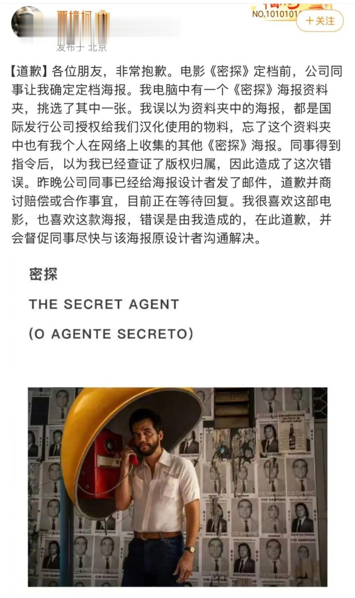 贾樟柯在酬酢平台上致歉 图片开头于聚集 据悉,电影《特务》是由巴西导演小克莱伯·门多萨捏导的剧情片,旧年获取了金球奖两项大奖。由贾樟柯创办的公司“幽闲电影刊行科”则稳固该片在中国内地的刊行。 3月16日,贾樟柯在酬酢平台上称电影《特务》定档,并附上中语海报。各媒体平台纷繁发布这一音问,并使用了贾樟柯发布的海报。之后,一位国外想象师称,“幽闲电影刊行科”未经授权使用了他想象的海报,侵扰了其常识产权。