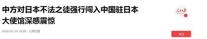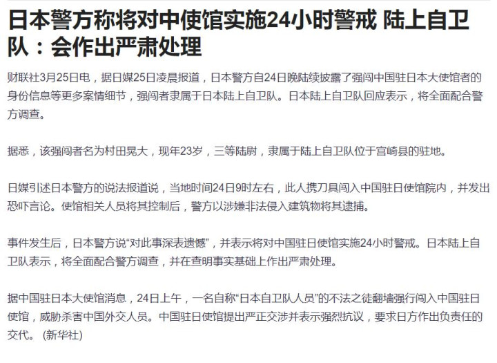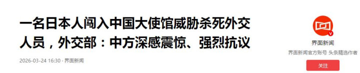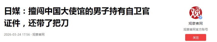 灌木丛里那把刀,把一场蓝本还能压在纸面上的危急,硬生生顶到施行前台。 3月24日早上9点,日本现役自保队军官村田晃大,从中国驻日大使馆旁的四层确立翻墙闯入。 前一天中午私行离营后失联,次日上昼闯入使馆——一个本应被秩序捆住的东谈主,走到了应酬安全的红线眼前。